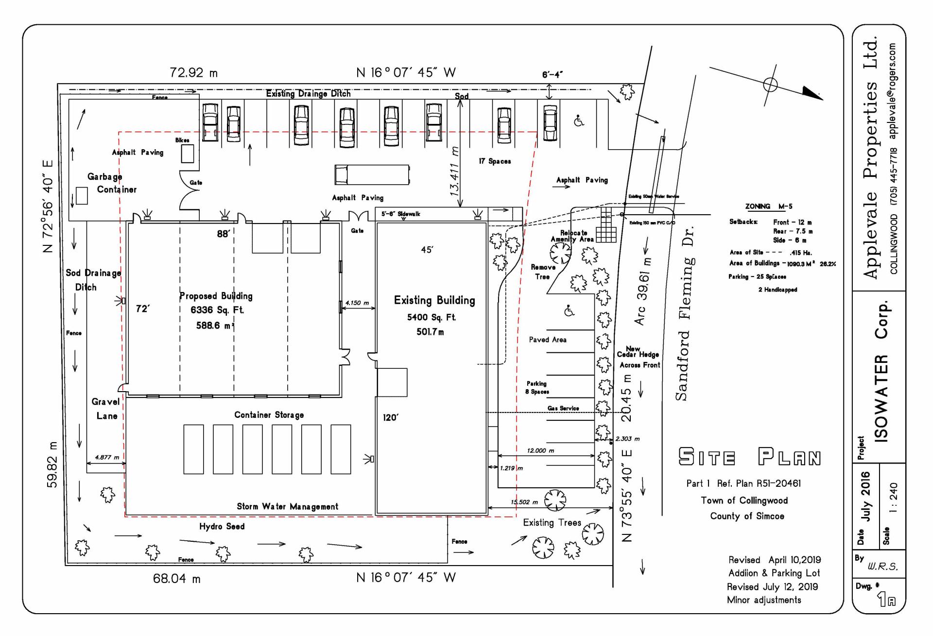 Project Description: This amendment proposes a new 6,336 sq. ft. building in the rear of the site, extension of the existing asphalt parking area, and grading/drainage modifications. The existing industrial building is a 5,400 sq. ft. for a heavy water processing facility which was processed in 2017 under D111117. A minor variance has also been submitted to reduce the front landscape buffer from 3.0 to 2.3 metres.
