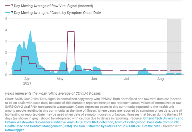 Recent wastewater data support information from reported cases of COVID-19, showing sustained low levels of COVID-19 infection in Collingwood, Midland and Orillia. Up-to-date wastewater sampling results for Simcoe County and Muskoka County are now available on the SMDHU website: https://www.simcoemuskokahealthstats.org/topics/infectious-diseases/a-h/covid-19/covid-19-wastewater-surveillance